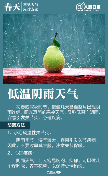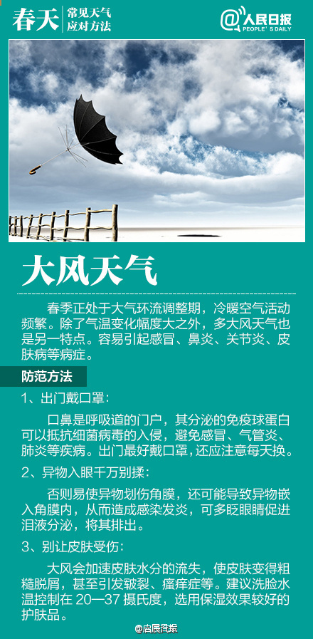 如何應對初春多變天氣作者:合眾電氣發布時間:2016-03-23瀏覽量:10899 次字體顯示:【大】【中】【小】 春季天氣調皮,昨天還日光融融閑賞花,今日就寒風瑟瑟緊添衣!大風、沙塵、陰雨等交替上演,讓感冒、過敏、關節炎等進入高發期。今天#世界氣象日#,四張圖教你應對春季多變天氣! 上一篇: HZXC-104D變壓器智能控制箱最新發貨現場下一篇: 面對問題疫苗,我們怎么辦?