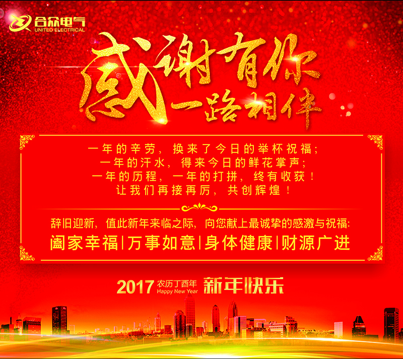 難忘的2016年與我們揮手告別了,嶄新的2017年帶著他迷人的芬芳向我們走來。在此武漢合眾電氣向在2016年給予我們支持、幫助的所有家人、客戶和親朋好友送上我們最真誠的感謝和祝福!