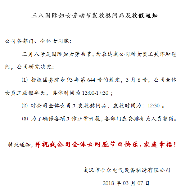 關于三八婦女節(jié),合眾電氣全體女員工放假的通知: