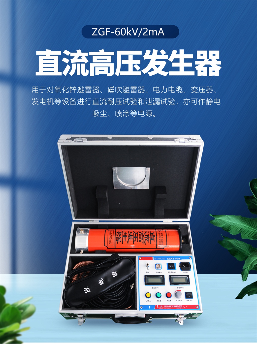 本儀器適用于電力、鐵路、化工、工礦、冶金、鋼鐵等部門(mén)對(duì)氧化鋅避雷器、磁吹避雷器、電力電纜、變壓器、發(fā)電機(jī)等設(shè)備進(jìn)行直流耐壓試驗(yàn)和泄漏試驗(yàn),亦可作靜電吸塵、噴涂等電源。