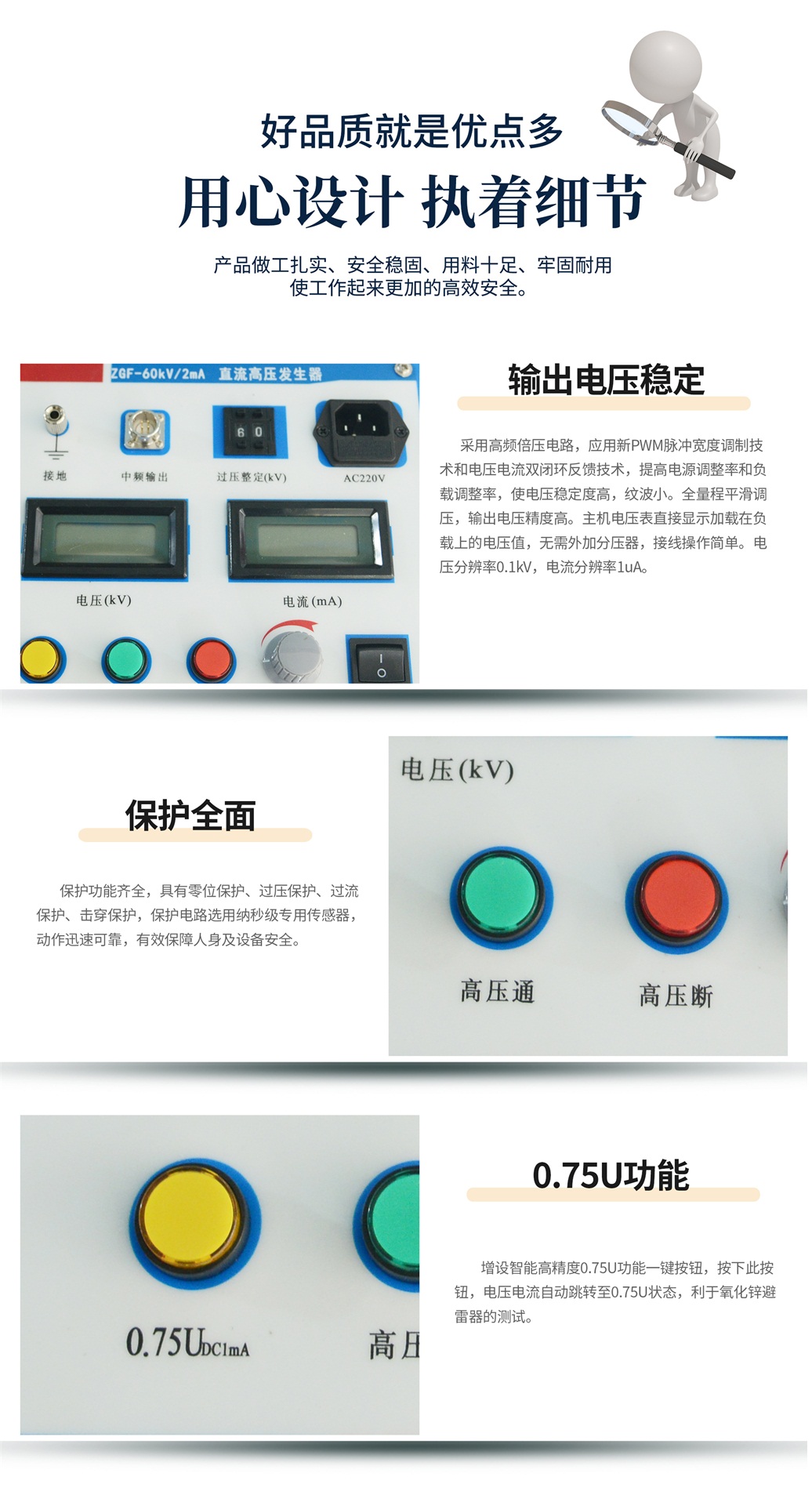 本儀器采用高頻倍壓電路,應(yīng)用新PWM脈沖寬度調(diào)制技術(shù)和電壓電流雙閉環(huán)反饋技術(shù),提高電源調(diào)整率和負(fù)載調(diào)整率,使電壓穩(wěn)定度高,紋波小。使用進(jìn)口大功率IGBT器件及其驅(qū)動(dòng)技術(shù),消除開(kāi)關(guān)干擾,實(shí)現(xiàn)直流高壓發(fā)生器的高品質(zhì)和便攜性。選用進(jìn)口高頻高壓整流二極管,使倍壓筒更加小巧輕便,提升整機(jī)效率。根據(jù)EMI電磁干擾和EMC電磁兼容理論,采用屏蔽、隔離和接地等措施,提升整機(jī)安全性,并能承受額定電壓放電而不損壞。儀器保護(hù)功能齊全,具有零位保護(hù)、過(guò)壓保護(hù)、過(guò)流保護(hù)、擊穿保護(hù),保護(hù)電路選用納秒級(jí)專(zhuān)用傳感器,動(dòng)作迅速可靠,有效保障人身及設(shè)備安全。過(guò)壓整定選用數(shù)字撥碼開(kāi)關(guān),操作簡(jiǎn)單并具有較高的整定精度。增設(shè)智能高精度0.75U功能按鈕,利于氧化鋅避雷器的測(cè)試。