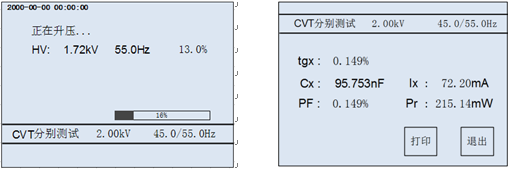 相關參數設置好了后長按“啟動測試”單,進入測試菜單(如圖5-7)。測試過程中電壓值一項是根據先前所選擇的測試電壓平滑至設置值后保持不變,然后自動開始測試。開始測試后根據先前所選擇的干擾頻率自動變頻到相應的頻率進行測試,測試完成后自動顯示測試結果(如圖5-7)。測試結果自動保存,可點擊“打印”按鈕打印本次測試結果。