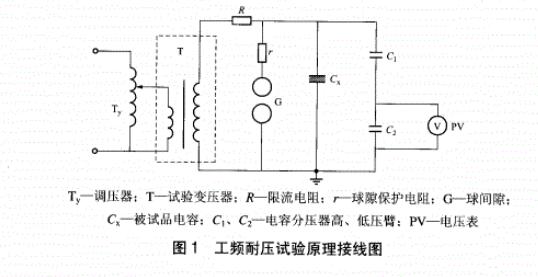 交流耐壓試驗(yàn)的接線,應(yīng)按被試品的電壓、容量和現(xiàn)場(chǎng)實(shí)際試驗(yàn)設(shè)備條件來決定。通常試驗(yàn)變壓器是成套設(shè)備。圖1是一種典型的試驗(yàn)接線。