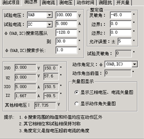 微機繼電保護測試儀的測邊界作者:合眾電氣發布時間:2021-08-16瀏覽量:3715 次字體顯示:【大】【中】【小】 微機繼電保護測試儀的測邊界。 測邊界 自動測試出方向性保護的兩個動作邊界,并且自動計算出最大靈敏角。在“顯示動作角矢量圖”的顯示方式下,從主界面右側的圖中可以很直觀地觀察到兩條邊界線和最大靈敏線。上一篇: 微機繼電保護測試儀試驗參量下一篇: 微機繼電保護測試儀測試項目的界面說明