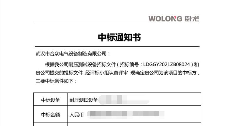 武漢市合眾電氣中標(biāo)臥龍電氣耐壓測試試驗項目