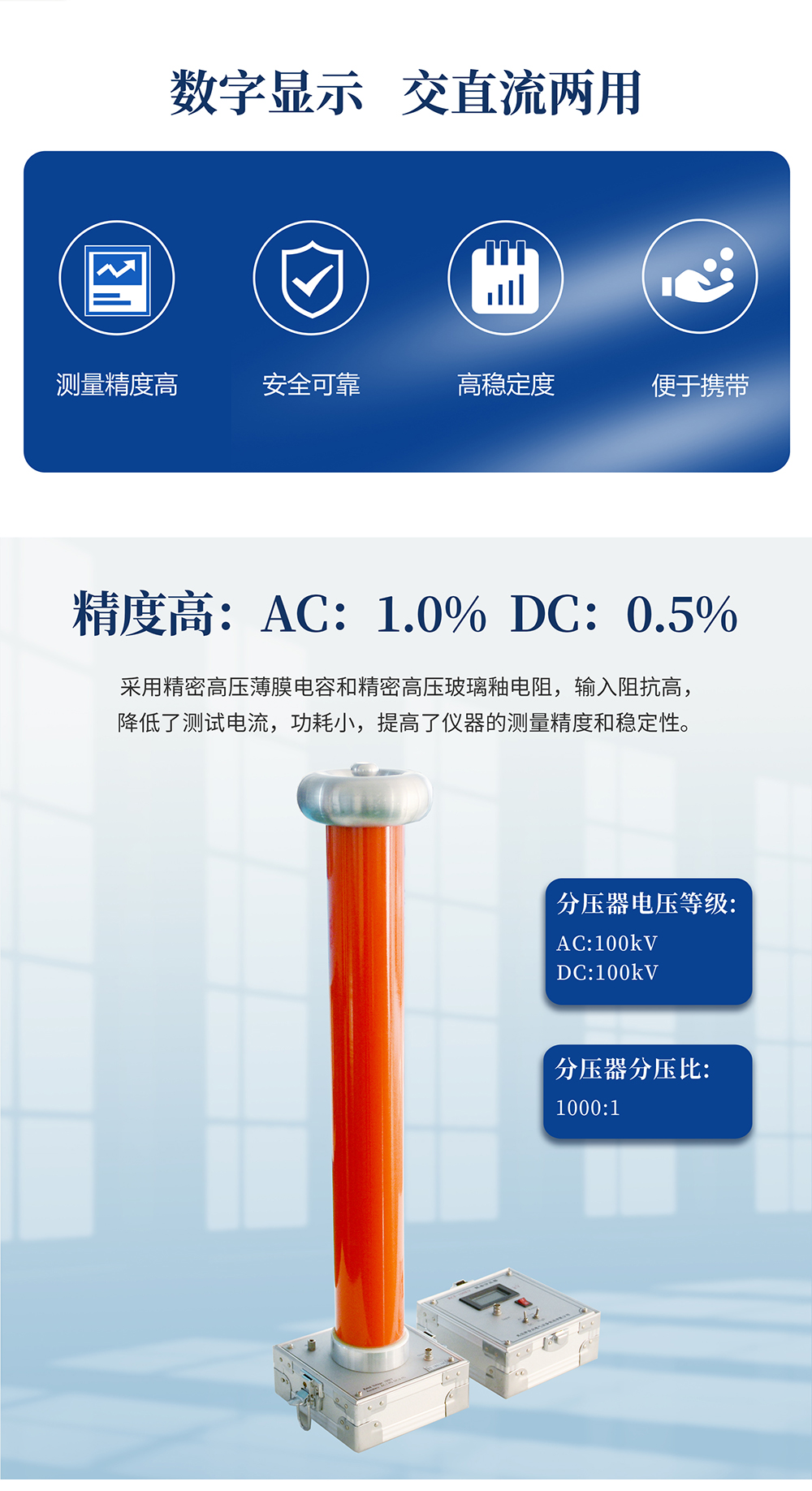 采用精密高壓薄膜電容和精密高壓玻璃釉電阻,輸入阻抗高,降低了測試電流,功耗小,提高了儀器的測量精度和穩定性;信號處理部分,采用高性能OP進行信號放大,運用新雙積分式AD采樣技術,四位半液晶顯示,高分辨力達到0.001kV,是高壓靜電電壓表的更新換代產品。