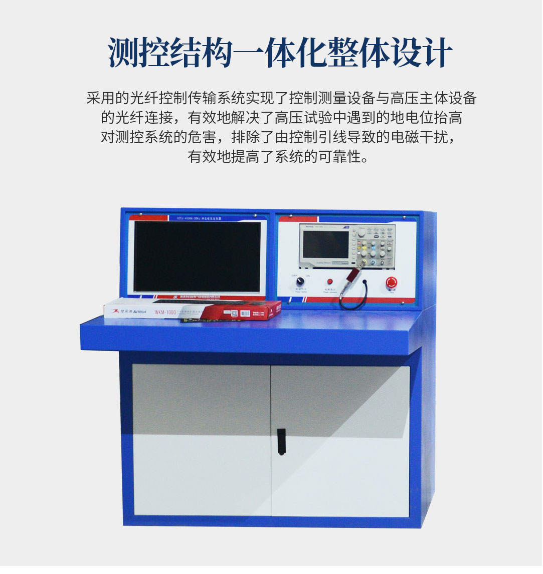 4、采用的光纖控制傳輸系統(tǒng)在國內(nèi)高壓試驗設(shè)備中是創(chuàng)新,它實現(xiàn)了控制測量設(shè)備與高壓主體設(shè)備的光纖連接,有效地解決了高壓試驗中遇到的地電位抬高對測控系統(tǒng)的危害,排除了由控制引線導(dǎo)致的電磁干擾,極大地提高了系統(tǒng)的可靠性。